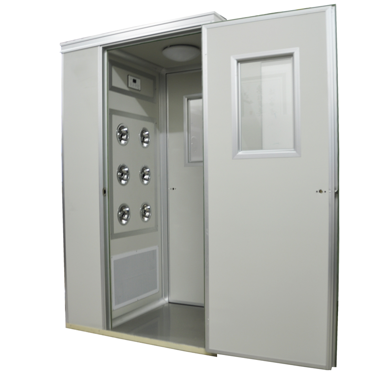 风淋室是超净化工作厂房的重要配置设备,专用于作业人员净化工作环境前的人身风淋,以清除人员表面的尘埃,同时也起到与外界的气闸作用,以防止未被净化的空气进入净化区域,能确保净化环境的洁净度,它是创造洁净空气环境的一种具有良好效果的专用设施。FLB系列风淋室工作原理 接通电源后(按下一个按钮通电,再按一下即断电),风淋室进入工作状态,工作人员开启前门即启动低噪音风机进行风淋状态,风淋室内空气经预过滤器压入静压箱,经过过滤器压出,通过二级过滤器装置使被净化后的空气从箱体两侧的喷口高速喷出,吹落物体表面上的尘