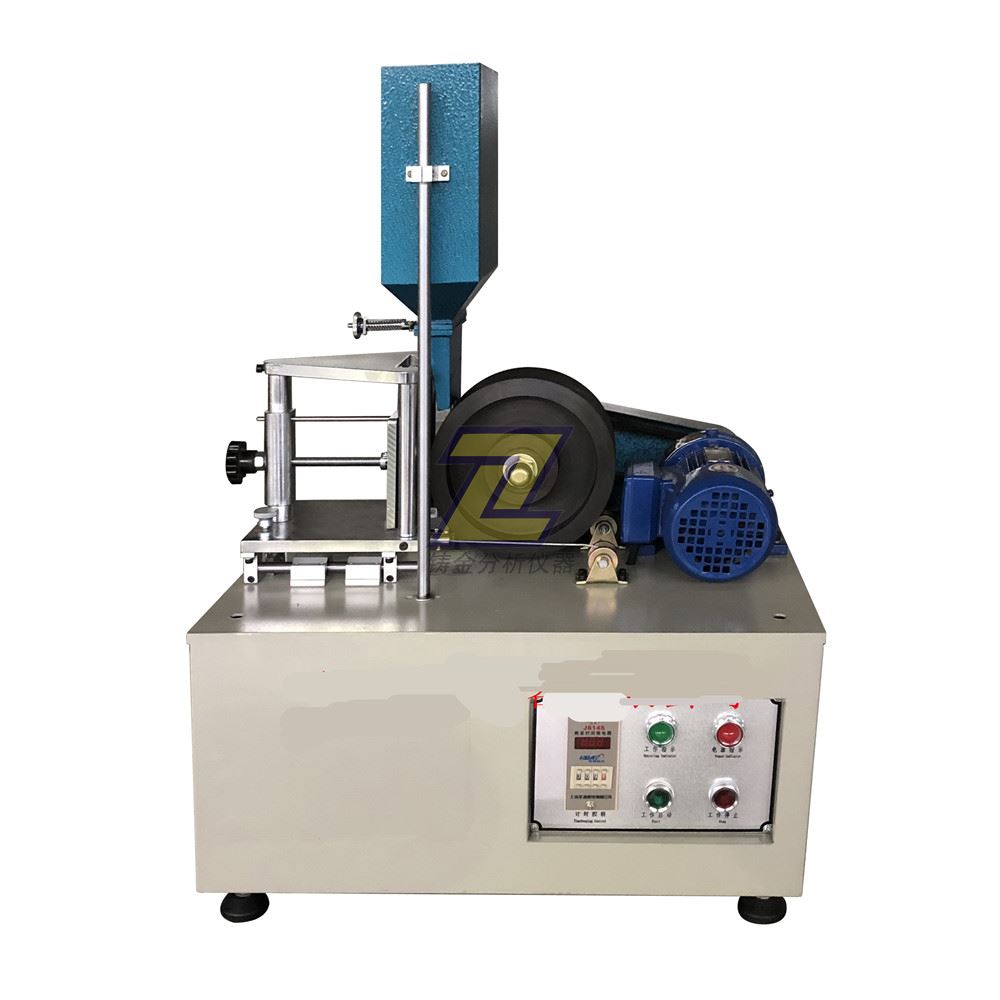 仪器由动力传动部分、试样夹具部分、磨料贮供部分及电气控制部分组成。磨轮以恒定转速转动,通过施压砝码以一定压力使试样接触摩擦钢轮,磨料按规定流量(100g/100r/±10g/100r)均匀进入研磨区,在磨料的作用下使试样表面产生磨坑。通过测量试样表面的磨坑弦长(精确至0.5㎜),计算磨坑体积来表示试样的磨损程度。每块试样以两个部位的平均磨损体积进行评定。
